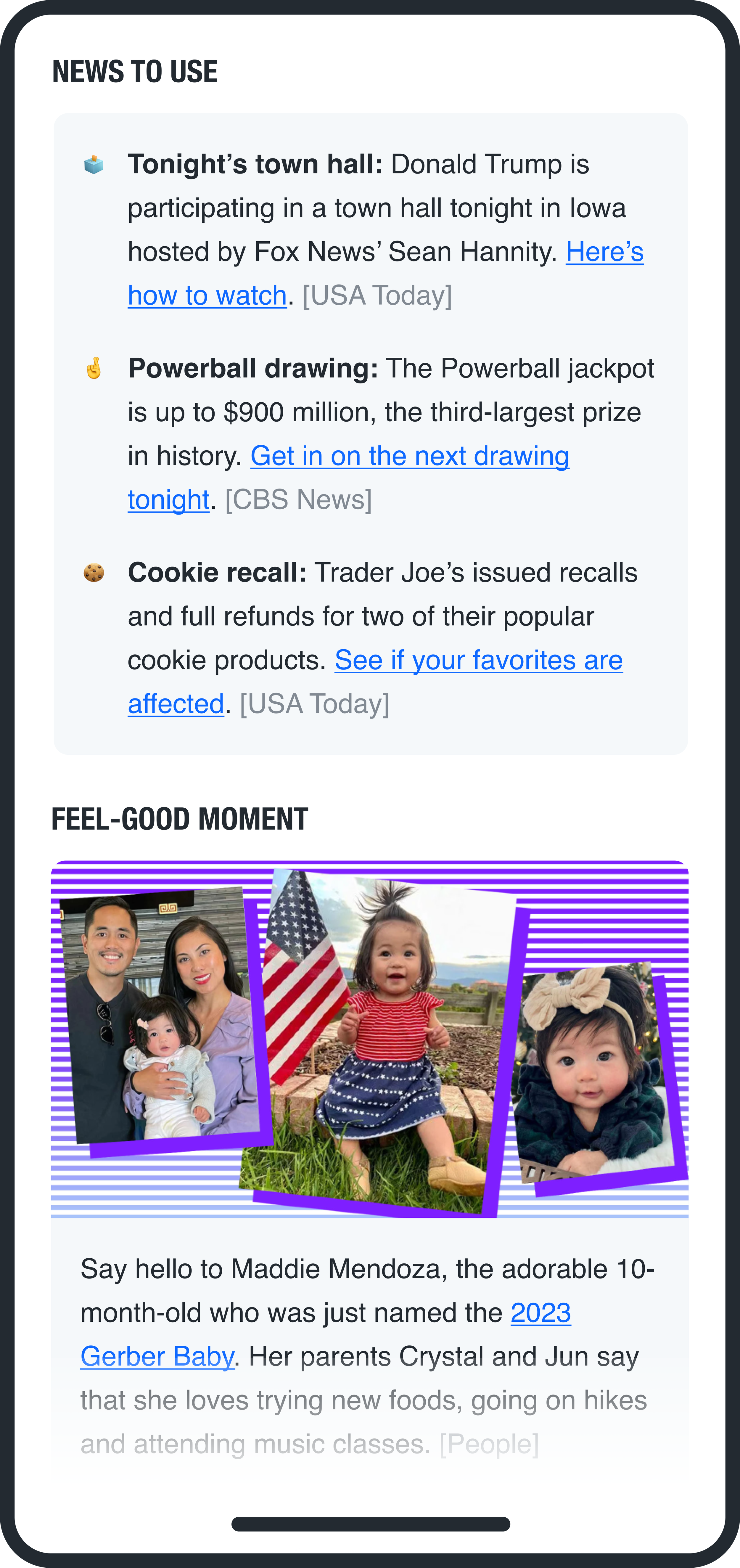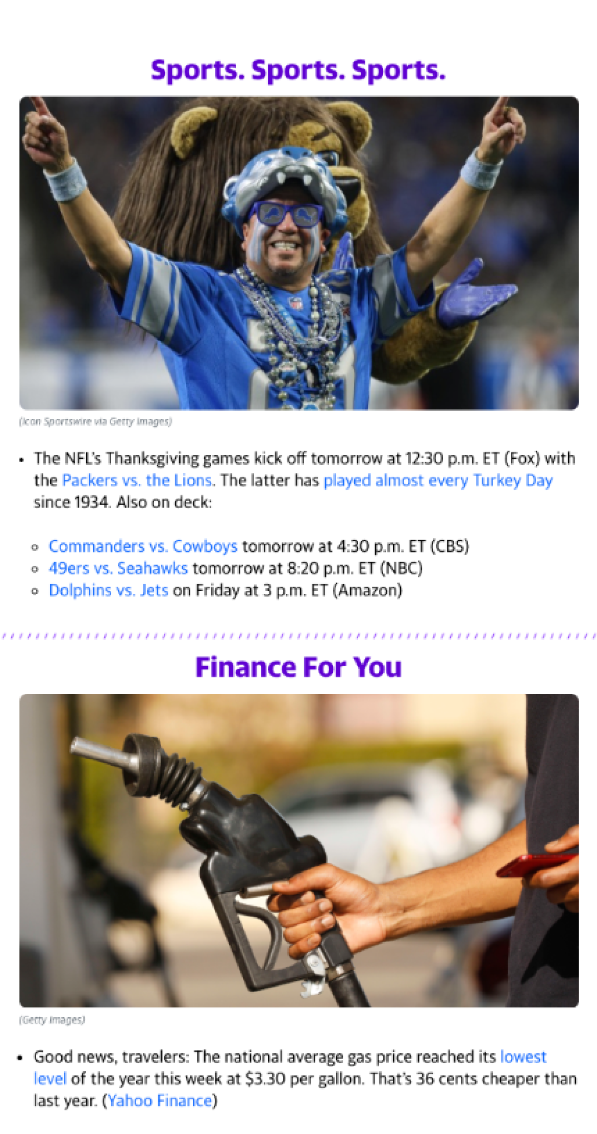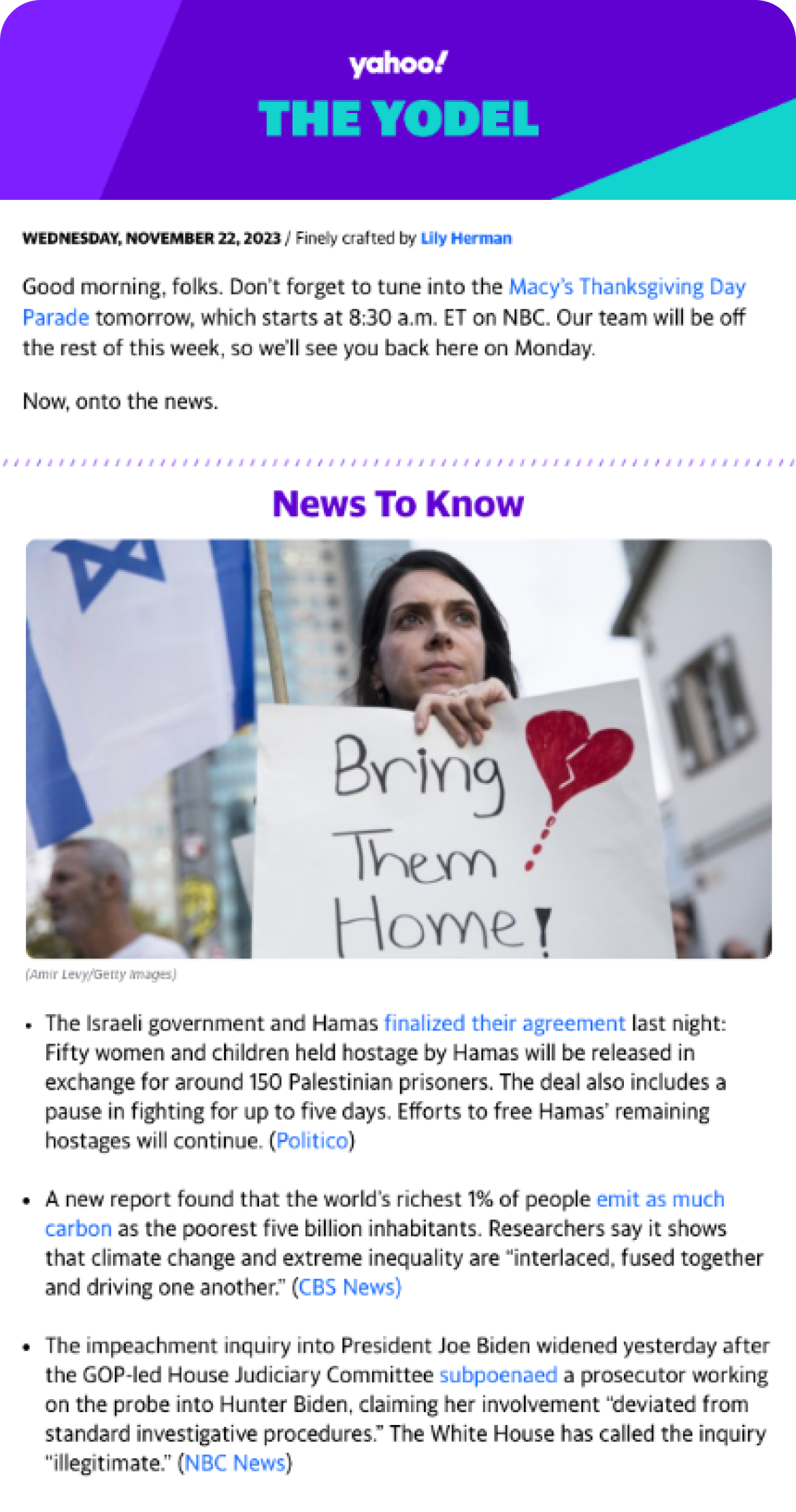 The Yodel is a 3-year-old briefing newsletter. It’s a daily roundup of news sports, finance and more. It features 7 sections, 1 lead image followed by 3 unrelated stories.